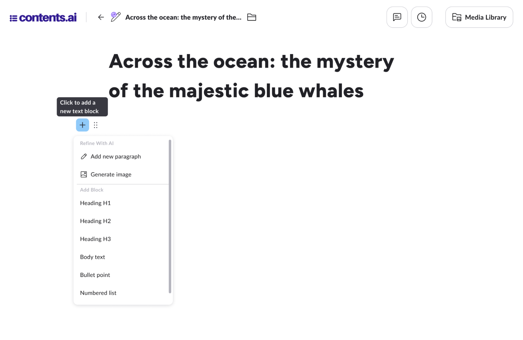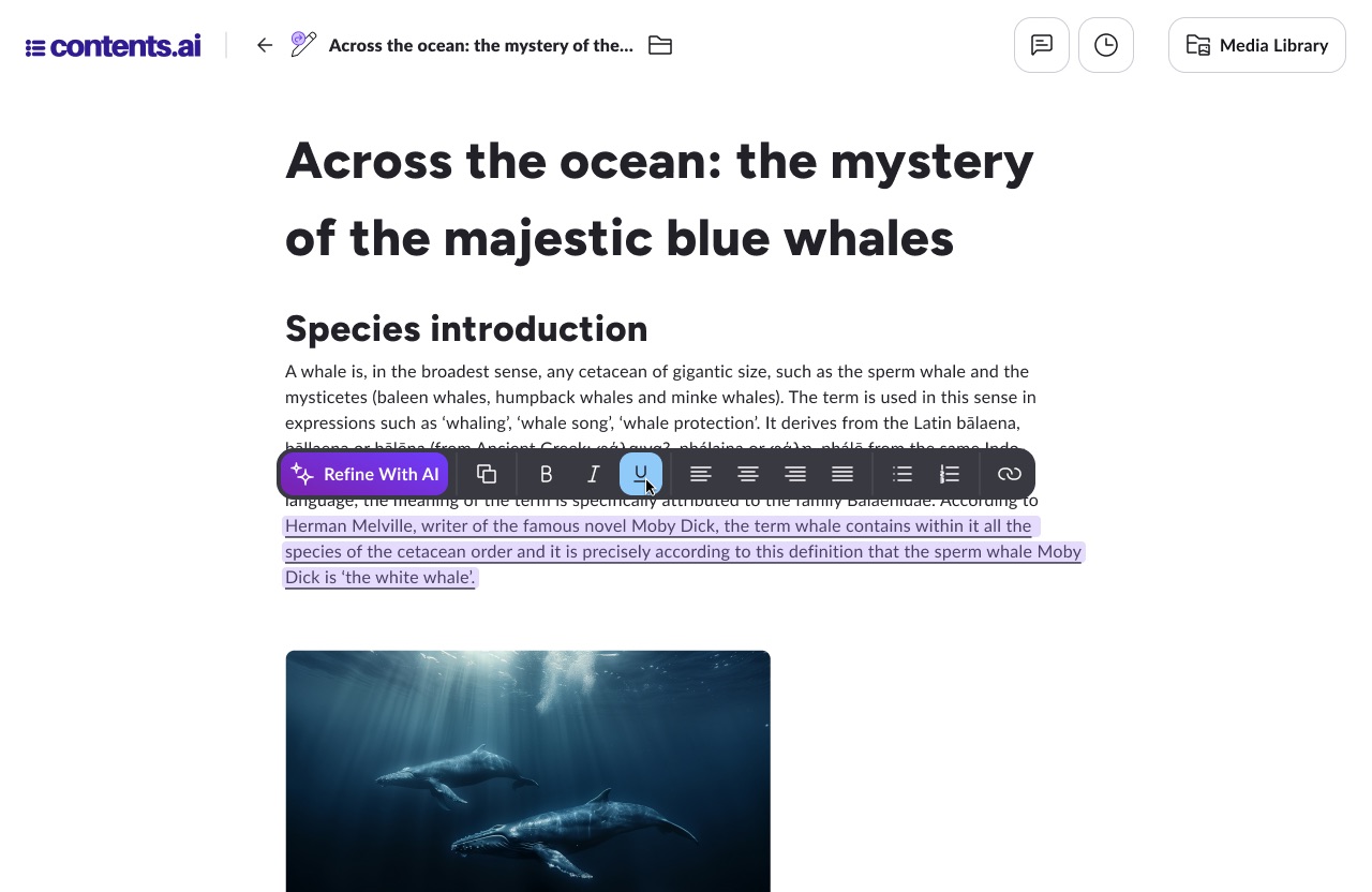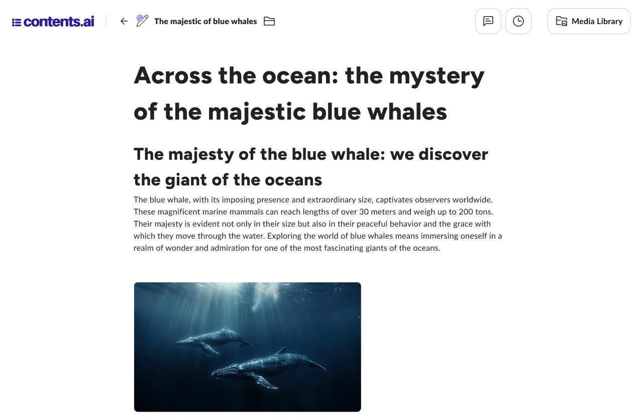 Contents ti permette di modificare e rielaborare il testo generato tramite l’ausilio dei tool. Il nuovo editor di Contents presenta funzionalitá e interazioni rinnovate, in una nuova esperienza dove la scrittura diventa in primo piano.