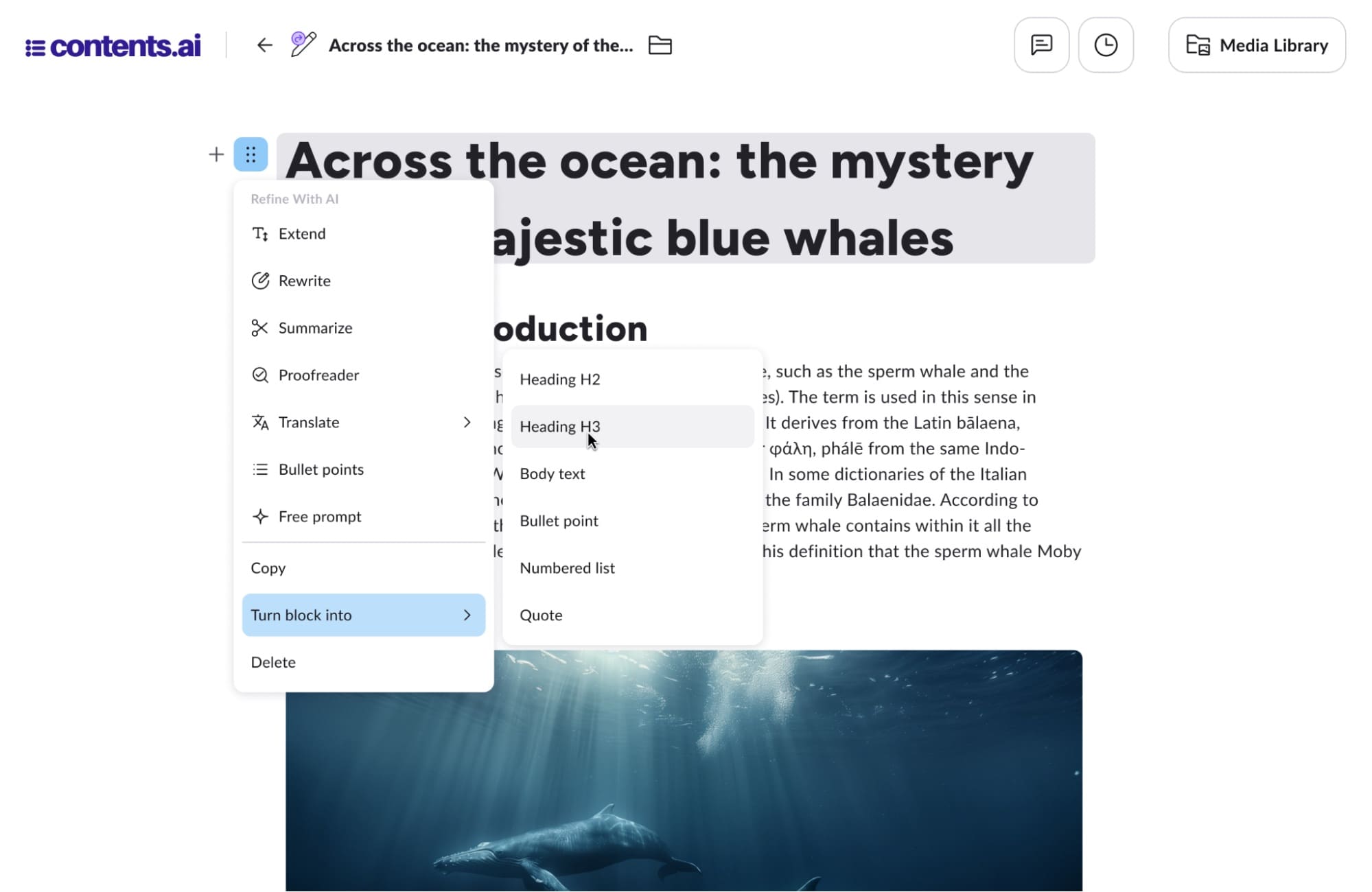 - Trasforma blocco: trasforma il blocco selezionato in un’altra tipologia di blocco, ovvero intestazione (tutte e tre le tipologie, corpo, quote, elenco puntato e numerato). Ad esempio, se il blocco selezionato è un’intestazione H3, con questa funzionalità posso trasformarlo in una intestazione H1.